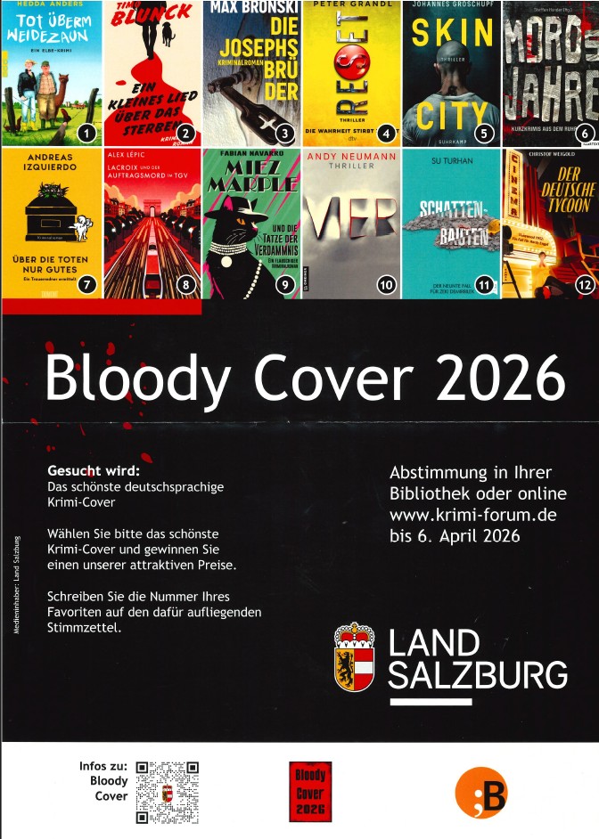 Schreibensie die Nummer Ihres Favoriten auf den dafür aufliegenden Stimmzettel. Abstimmung in der Bibliothek Abtenau oder online www.krimi-forum.de bis 6. April 2026
