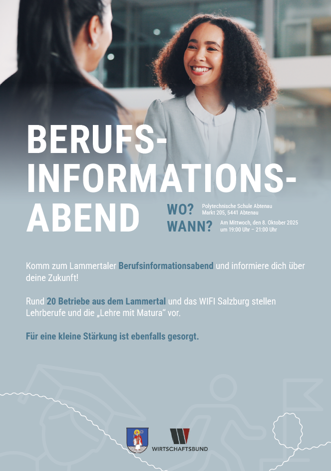 Am 8. Oktober 2025 um 19:00 Uhr laden der Wirtschaftsbund Abtenau und die Marktgemeinde Abtenau alle interessierten Schülerinnen und Schüler in die Polytechnische Schule Abtenau ein.